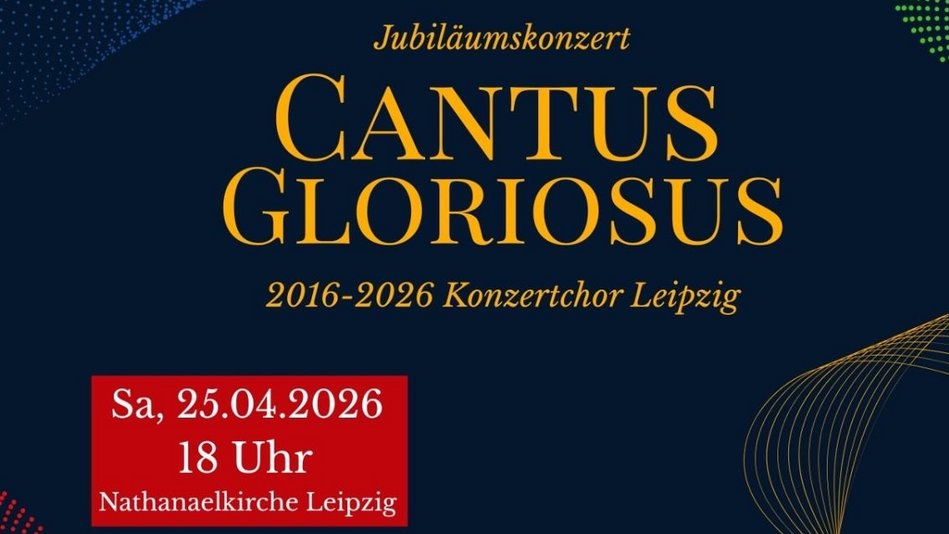 | Sa., 25. Apr. | 18:00 Uhr | Jubiläumskonzert: Konzertchor Leipzig Ev.-Luth. Nathanaelkirchgemeinde |